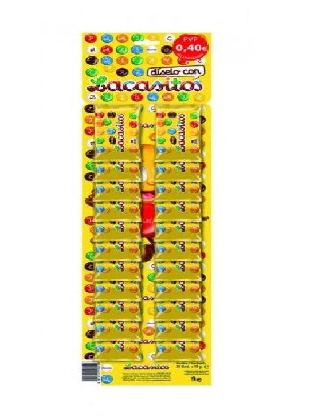 Azúcar, manteca de cacao, pasta de cacao, leche entera en polvo, leche desnatada en polvo, colorantes(E-171, E-163, E-100, E-101 E-120, E-141, E-160a y E-153), emulgente (lecitina de soja), agentes de recubrimiento(E-414 y E-903, E-901) y aroma.