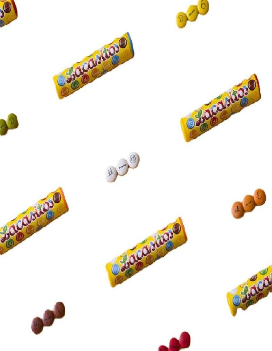 Chocolate con leche (62%) [azúcar, manteca de cacao, pasta de cacao, leche entera en polvo, leche desnatada en polvo, emulgente (lecitina de girasol) y aroma natural de vainilla. Cacao 37% mínimo], azúcar, almidón de arroz, agentes de recubrimiento (E-414, E-903, E-901), colorantes (E-163, E-101, E-120, E-141, E-160a, E-153).