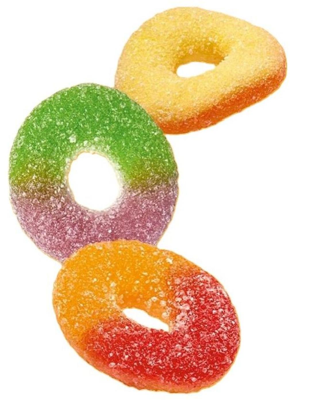 arabe de glucosa, azúcar, gelatina, acidulantes: acido cítrico y ácido láctico; humectante: sorbitol; aromas; colorantes: curcumina, carmines, azul brillante FCF