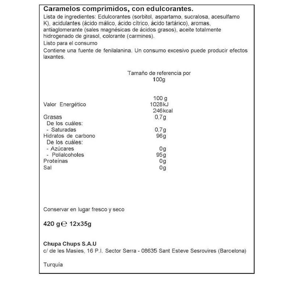 Edulcorantes (sorbitol, aspartamo, sucralosa, acesulfamo K), acidulantes (ácido málico, ácido cítrico, ácido tartárico), aromas, antiaglomerante (sales magnésicas de ácidos grasos), aceite totalmente hidrogenado de girasol, colorante (carmines).