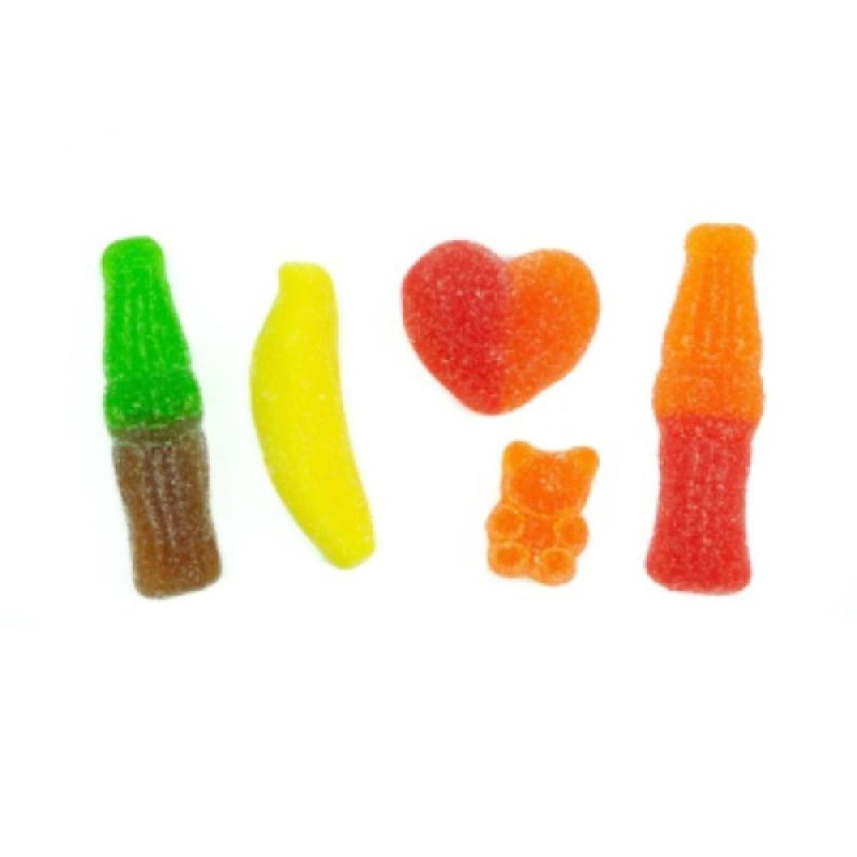 Surtido de caramelos de goma de Damel. Con cobertura de azúcar. Encontrarás botellas, plátanos, corazones, ositos...