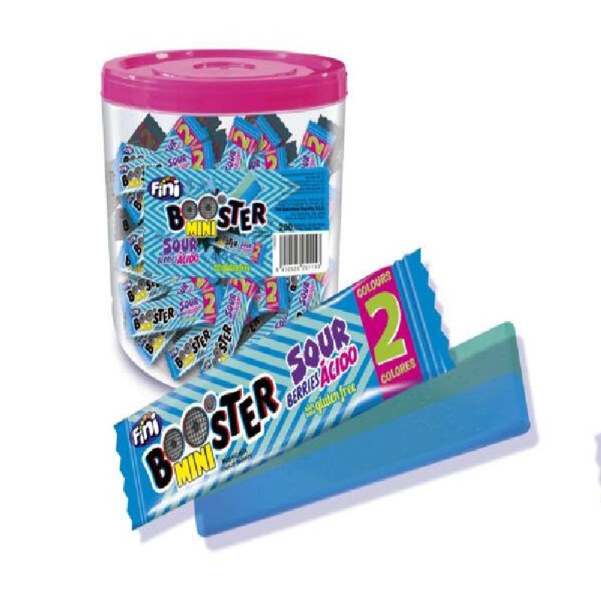 La caja contiene 200 unidades de caramelos blandos de cereza ácida Booster Mini. Los caramelos Booster Mini están empaquetados individualmente, en dos colores diferentes.