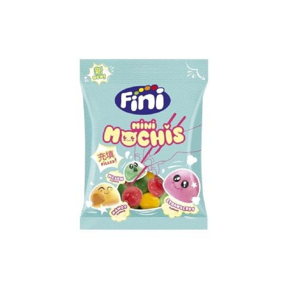 Nueva golosina de la marca Fini. Caramelos de goma con una textura tierna y rellenos de gelatina. Con 3 sabores surtidos: Fresa, Mango y Melón.