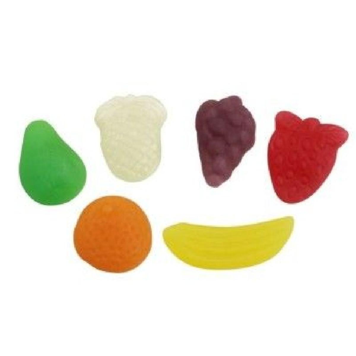 Caramelos de goma con forma de frutas. Con una doble textura. Una cobertura más dura con un relleno blandito.