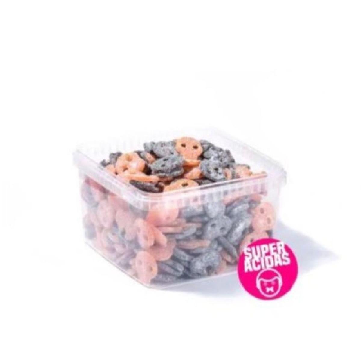CALAVERAS ACIDAS MORAS Y NARANJAS 290uds son gomas ácidas con forma de calavera de mora y naranja en un tarro de 290 unidades.