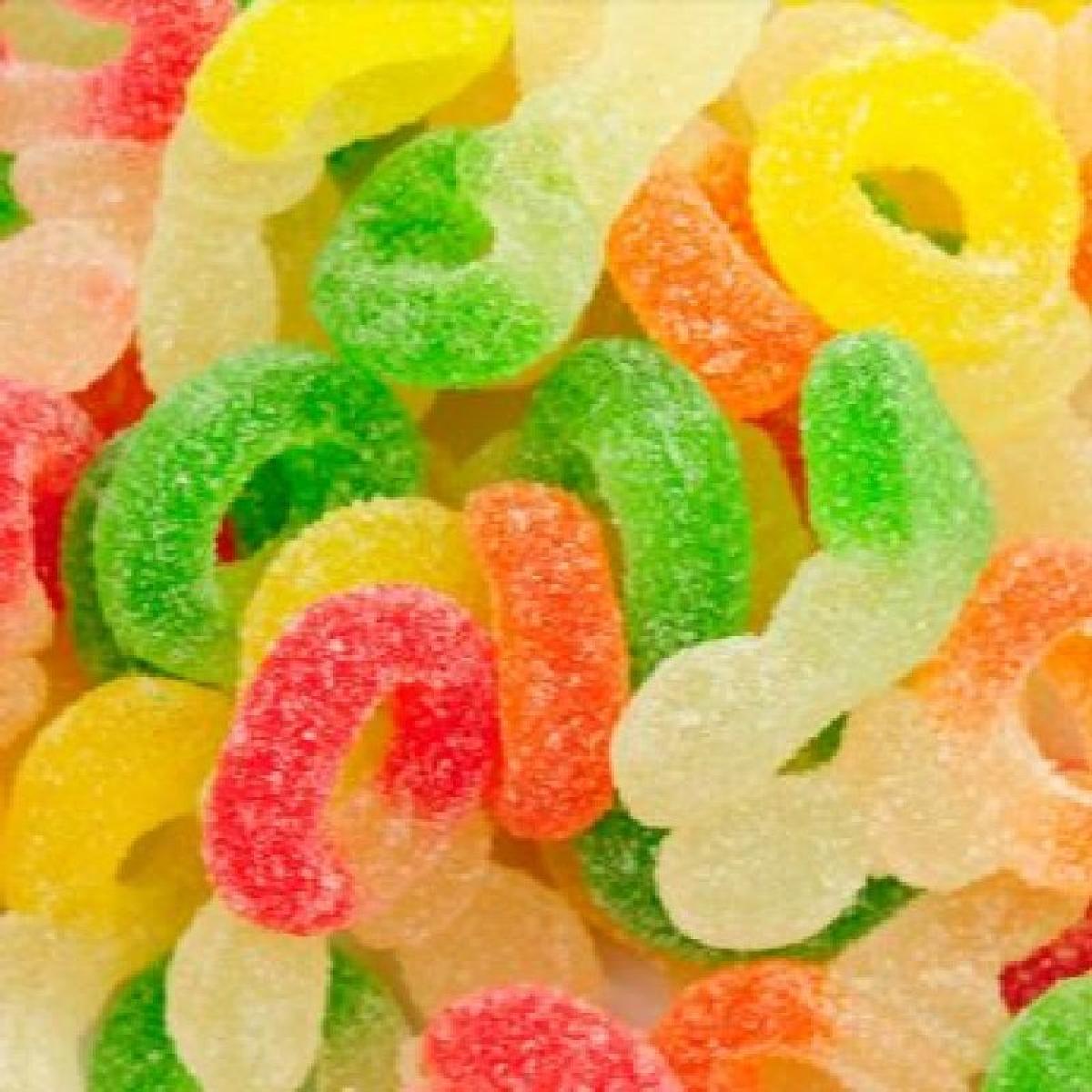 Azúcar, jarabe de glucosa, agua, gelatina; acidulante: E330; aromas; colorantes: E102, E129, E133.