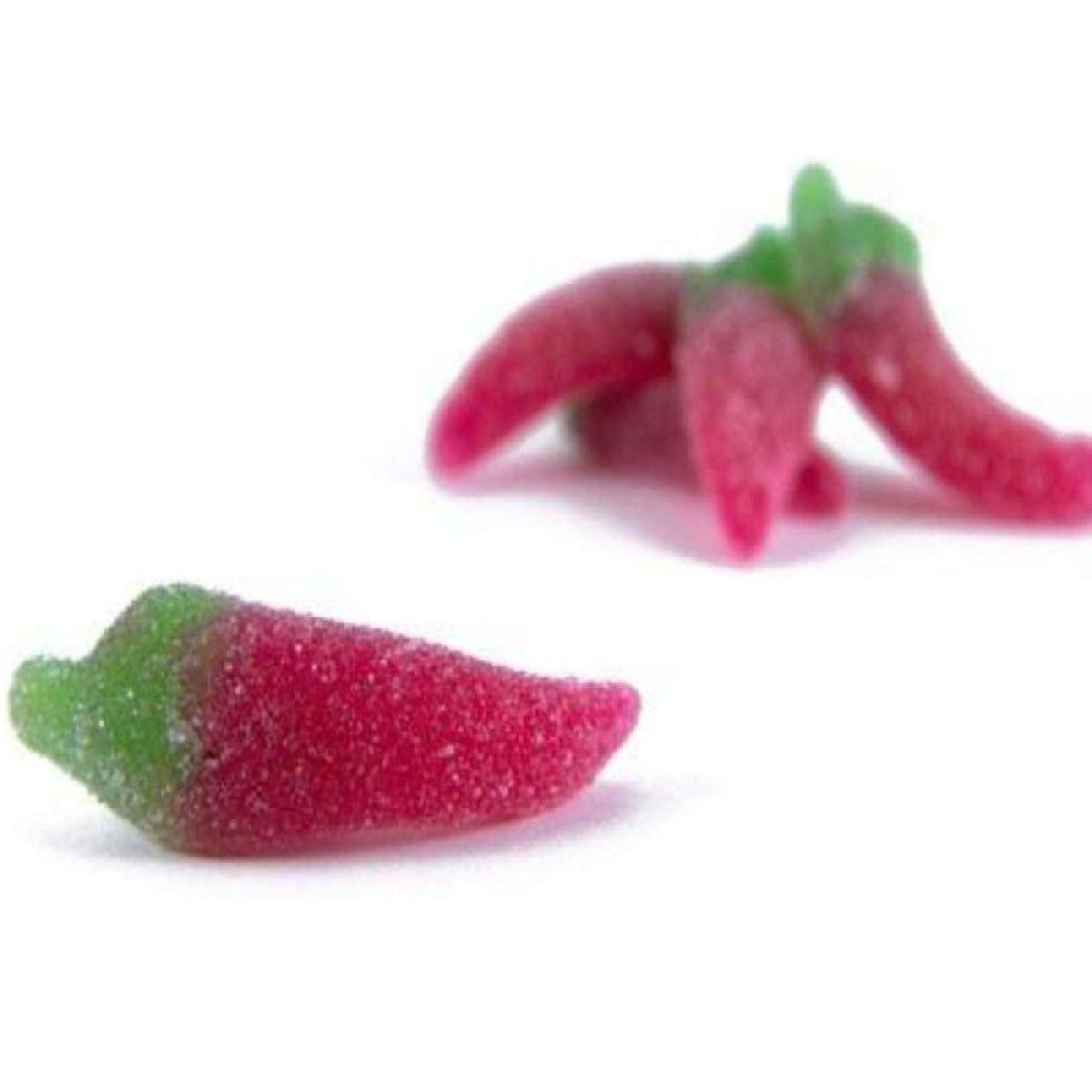 Golosinas con forma de guindillas. Perfecta para los amantes del picante. Con cobertura de azúcar. En tonos rojos y verdes. Presentado en una bolsa con 250 unidades. Medidas por pieza aprox: 5.5cm. x 2cm.